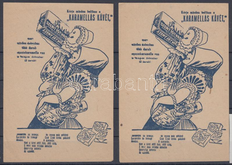 2 db reklámcédula a Szt. István karamellás kávéról 9x13 cm https://www.darabanth.com/de/190-Fernauktion/190.0/Andere-Sammelgebiete/Werbungen~800033/2-db-reklamcedula-a-Szt-Istvan-karamellas-kaverol-9x13-cm~II714546