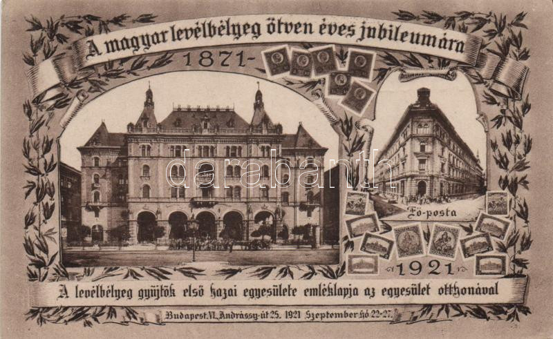 A magyar levélbélyeg 50 éves jubileuma 1921, a levélbélyeggyűjtők egyesületének otthona, főposta / The 50th anniversary of the Hungarian postage stamp in 1921, association of the stamp collectors, Budapest main post office So. Stpl