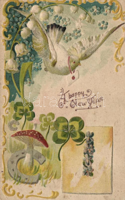 New Year, flower, pigeon, clover, Emb. litho (EK) https://www.darabanth.com/de/190-Fernauktion/190.0/Ansichtskarten/GruC39Fkarte~800126/New-Year-flower-pigeon-clover-Emb-litho-EK~II716880