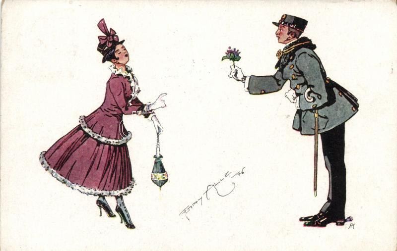 Lady with soldier s: Ferry Alle https://www.darabanth.com/de/190-Fernauktion/190.0/Ansichtskarten/Kunstlerkarten~800101/Lady-with-soldier-s-Ferry-Alle~II716828