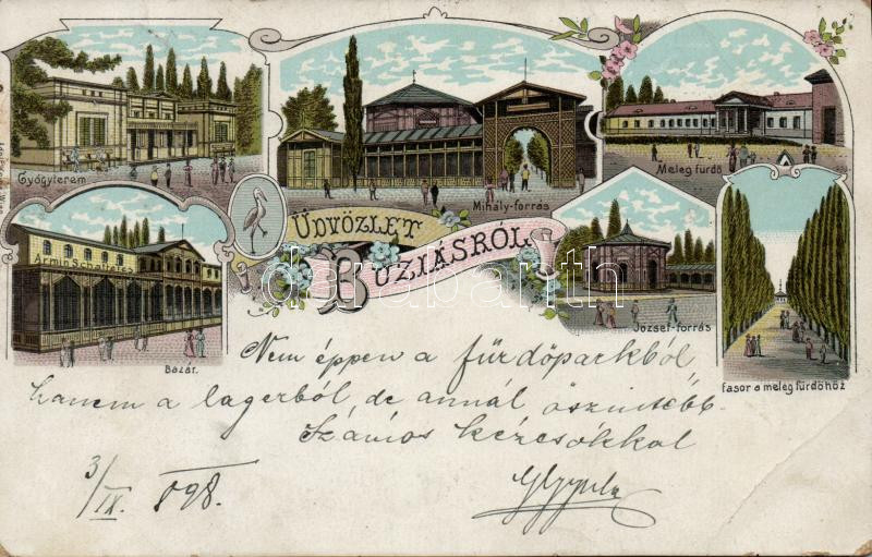 1898 Buziás Gyógyterem, Mihály és József forrás, Meleg fürdő, bazár, f... https://www.darabanth.com/de/190-Fernauktion/190.0/Ansichtskarten/Siebenburgen~400014/1898-Buzias-Gyogyterem-Mihaly-es-Jozsef-forras-Meleg-furdo-bazar-fasor-a-meleg-furdoh~II714927