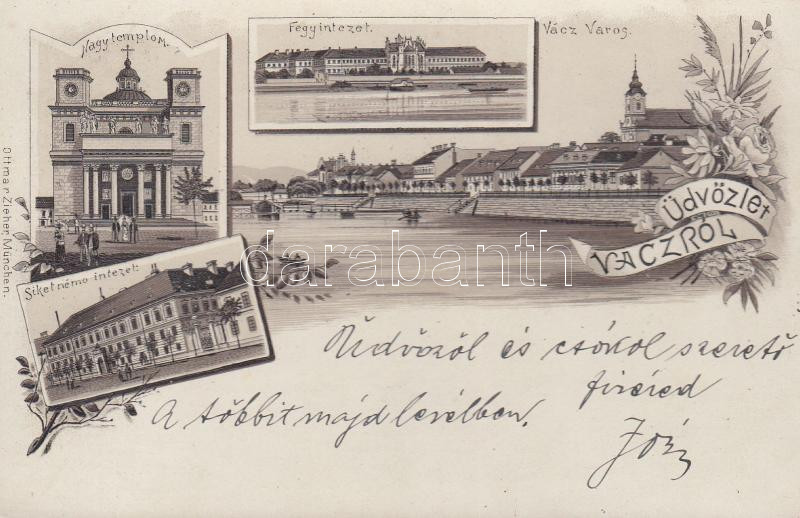 1899 Vác Siket-néma intézet, fegyintézet, Nagytemplom, floral, litho (... https://www.darabanth.com/de/190-Fernauktion/190.0/Ansichtskarten/Ungarn~400005/1899-Vac-Siket-nema-intezet-fegyintezet-Nagytemplom-floral-litho-kis-szakadas-small-tear~II714294