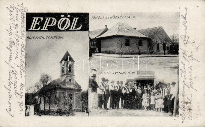 Epöl Kozlik J. vendéglője, iskola és községháza, katolikus templom https://www.darabanth.com/de/190-Fernauktion/190.0/Ansichtskarten/Ungarn~400005/Epol-Kozlik-J-vendegloje-iskola-es-kozseghaza-katolikus-templom~II714180
