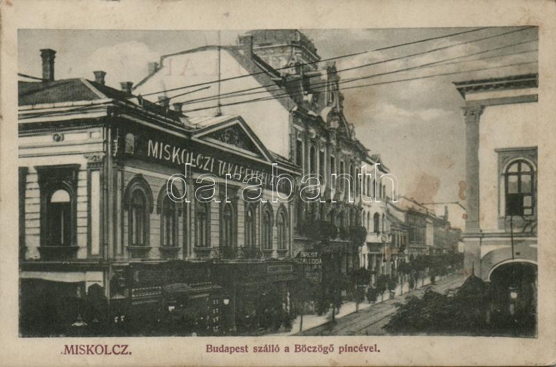 Beschreibung: Miskolc Budapest szálló, Böczögő pince, takarékpénztár (fa)
