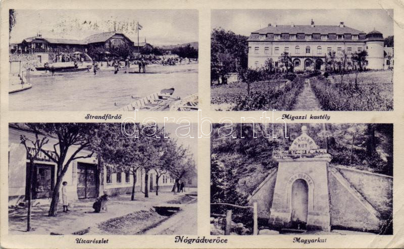 Beschreibung: Verőce (Nógrádverőce) utca áruházzal, strandfürdő, Migazzi kastély, Magyar kút (fa)