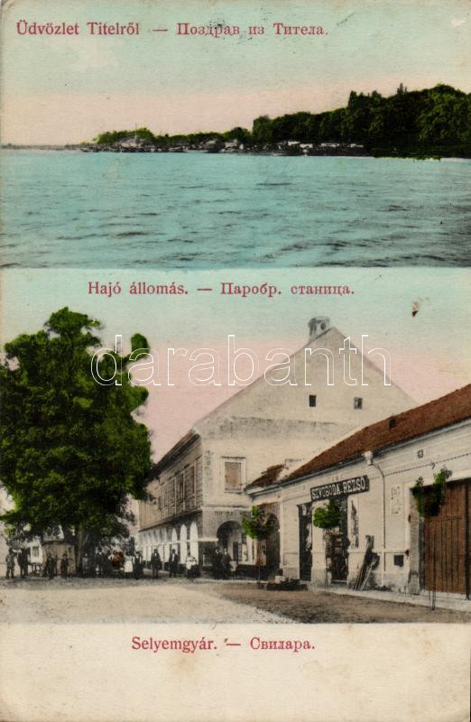 Beschreibung: Titel, selyemgyár, Szvoboda Rezső kereskedése / silk factory, shop