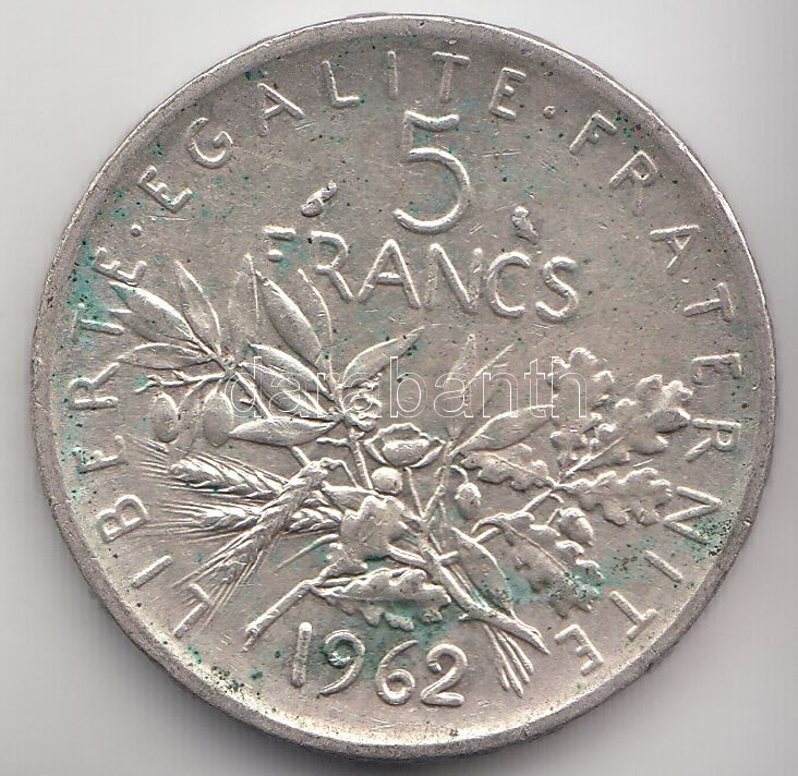 France 1962. 5 Francs Ag C:XF https://www.darabanth.com/de/190-Fernauktion/190.0/Numismatik/Auslandische-Munzen~600012/Franciaorszag-1962-5Fr-Ag-T2-3Cbr3EFrance-1962-5-Francs-Ag-CXF~II715430