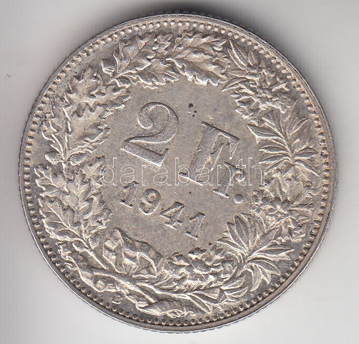 Switzerland 1941. 2 Francs Ag C:XF https://www.darabanth.com/de/190-Fernauktion/190.0/Numismatik/Auslandische-Munzen~600012/Svajc-1941-2Fr-Ag-T2-3Cbr3ESwitzerland-1941-2-Francs-Ag-CXF~II713807