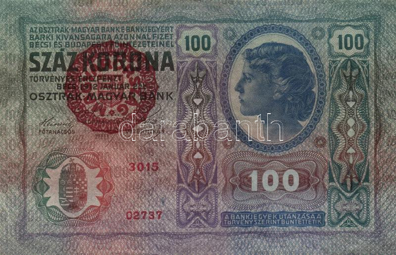 Beschreibung: 1912. 100K piros "Magyarország" körbélyegzéssel T:II-