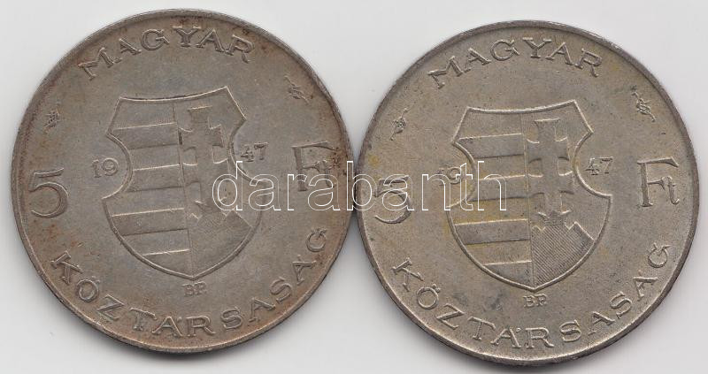 1947. 5Ft Ag "Kossuth" (2x) T:2-,3 https://www.darabanth.com/de/190-Fernauktion/190.0/Numismatik/Ungarische-Munzen~600008/1947-5Ft-Ag-Kossuth-2x-T2-3~II717135