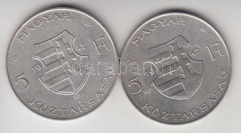 1947. 5Ft Ag "Kossuth" (2x) T:2-,3 https://www.darabanth.com/de/190-Fernauktion/190.0/Numismatik/Ungarische-Munzen~600008/1947-5Ft-Ag-Kossuth-2x-T2-3~II717241