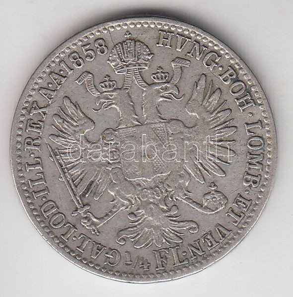 Ausztria / magyar verdejel 1858B 1/4Fl Ag "Ferenc József" T:2- https://www.darabanth.com/de/190-Fernauktion/190.0/Numismatik/Ungarische-Munzen~600008/Ausztria-magyar-verdejel-1858B-14Fl-Ag-Ferenc-Jozsef-T2-~II716774