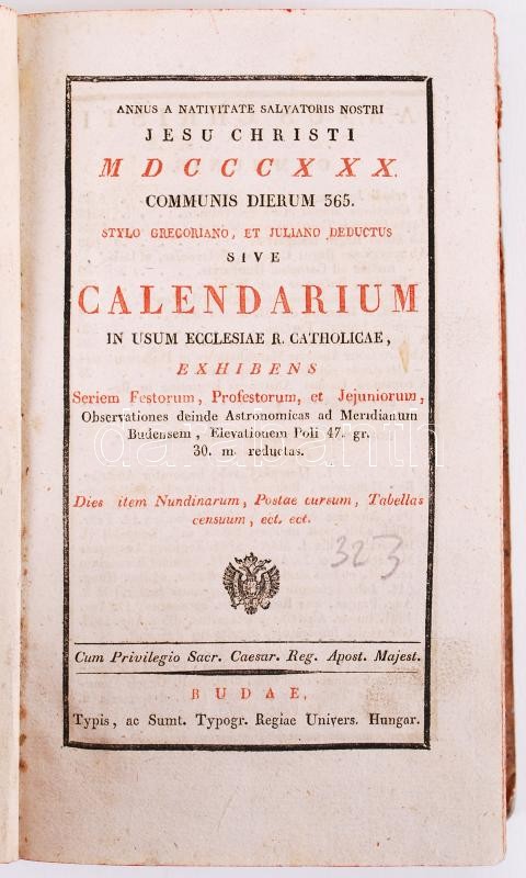 Annus a nativitate Salvatoris nostri Jesu Christi MDCCCXXX. communis dierum 365 stylo Gregoriano, et Juliano deductus sive calendarium in usum ecclesiae r. catholicae... Budae, [1830], Typ. Reg. Univ. Hungar. Korabeli papírkötésben, színezett élmetszéssel, gerincén és a hátsó kötéstáblán sérült, egyébként jó állapotú
