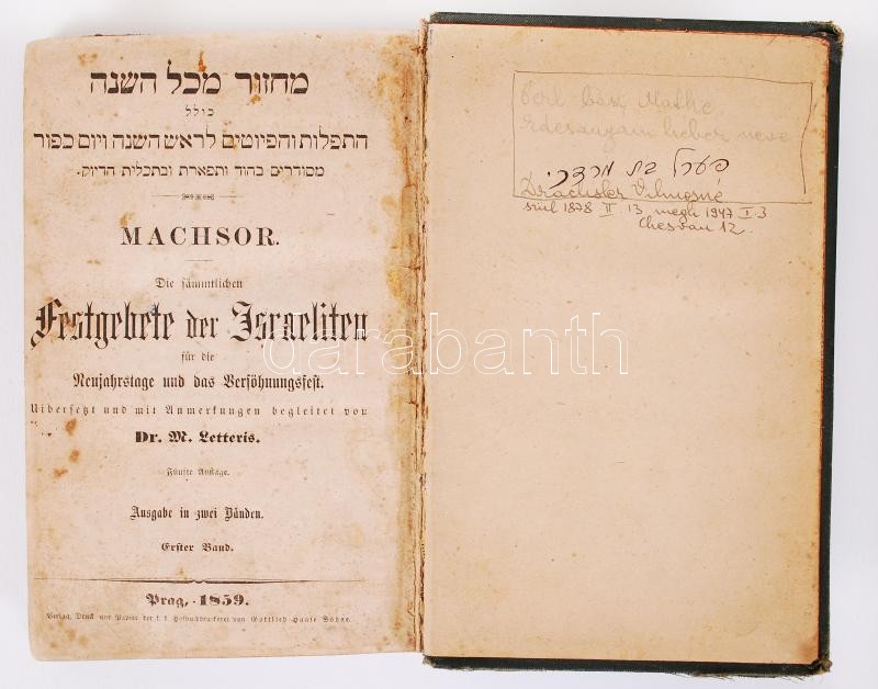 Machsor. Die sämmtlichen Festgebete der Israeliten für die Neujahrstage und das Versöhnungsfest. Uibersetzt und mit Anmerkungen begleitet von Dr. M. Letteris. Bd. I. Prag, 1859, Gottlieb Haase Söhne. Dombornyomott, aranyozott egészvászon kötésben (kissé viseltes) /