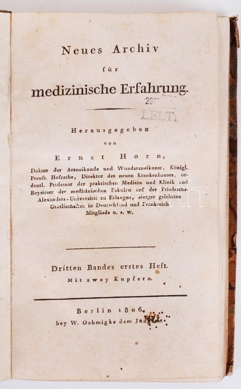 Neues Archiv für medizinische Erfahrung. Hrsg. Ernst Horn. Dritten Bandes erstes Heft. Berlin, 1806, W. Oehmigke dem Jüngern. Korabeli papírkötésben, jó állapotú (szélein kopottas) /