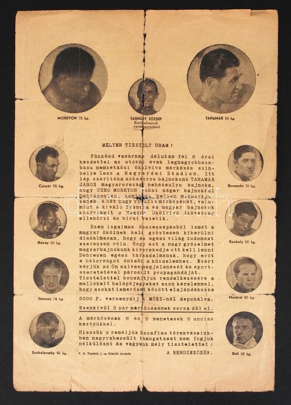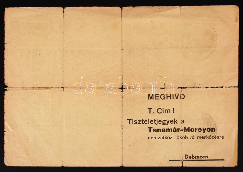 cca 1940 Meghívó a Debrecenben megrendezett Tanamár-Moreyon ökölvívó m... https://www.darabanth.com/de/191-Fernauktion/191.0/Andere-Sammelgebiete/Drucksachen~600008/cca-1940-Meghivo-a-Debrecenben-megrendezett-Tanamar-Moreyon-okolvivo-merkozesre~II724190
