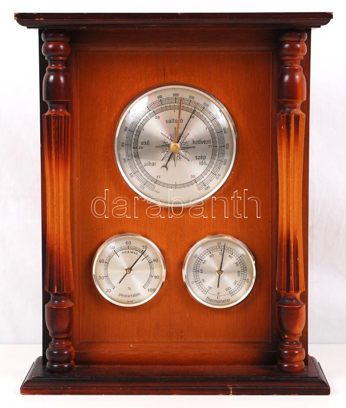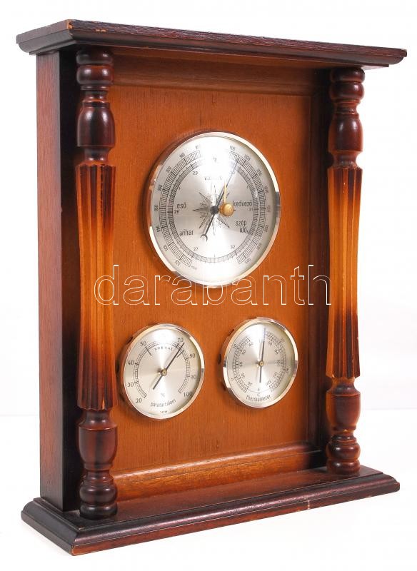 Beschreibung: Japán gyártmányú, magyarul feliratozott időjárásjelző készülékek (barométer, thermométer, páratartalom-mérő) fa keretben, 30x24x8cm