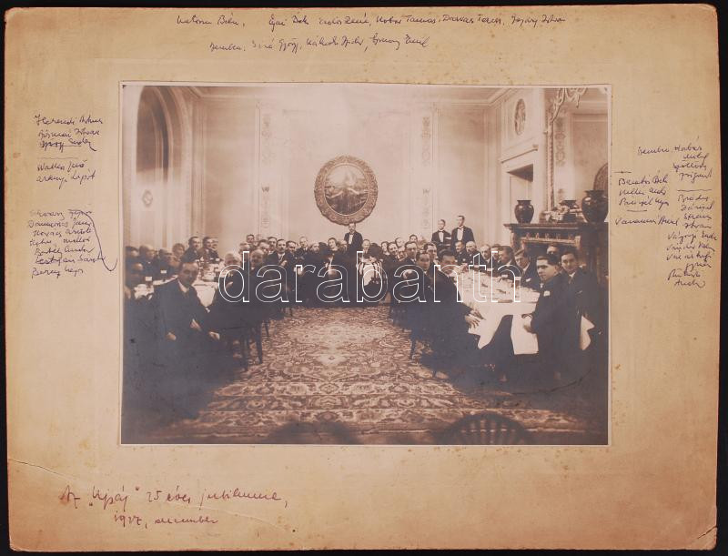1927 1 db magyar sajtótörténeti értékkel bíró, 17x23 cm-es fotó az Ujság című lap 25 éves jubileumi vacsorájáról; a hordozó kartonon feltüntették ki mindenki látható a képen (a hordozó karton mérete: 26x33 cm; egyik sarka törött, ragasztva)