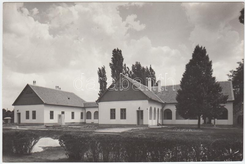 Beschreibung: 1957 A kiskunhalasi Háziipari Szövetkezet újjáépült csipkeháza, 13×9 cm