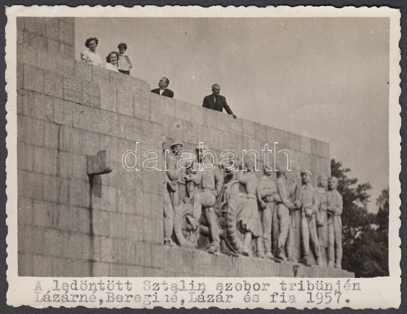 1957 "A ledöntött Sztálin szobor tribünjén Lázárné, Bereginé, Lázár és... https://www.darabanth.com/de/191-Fernauktion/191.0/Andere-Sammelgebiete/Foto~600035/1957-A-ledontott-Sztalin-szobor-tribunjen-Lazarne-Beregine-Lazar-es-fia-feliratozot~II722050
