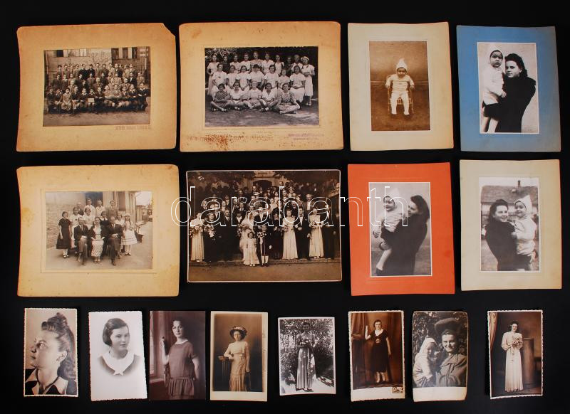 Beschreibung: Cca 1940 50 db főleg családi fotók + Cca 1930 7 db csoportkép: esküvői, iskolai tablókép, stb, 18×24 cm