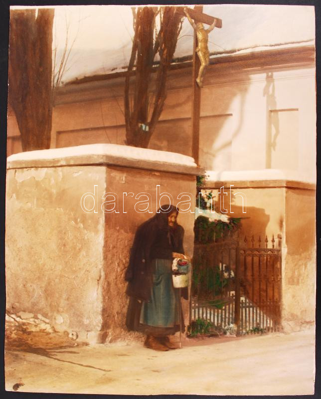 Beschreibung: Cca 1940 Thöresz Dezső fotóművész: Virágárus néni. Kézzel színezett vintage alkotása, kartonra kasírozva, 41x32cm.