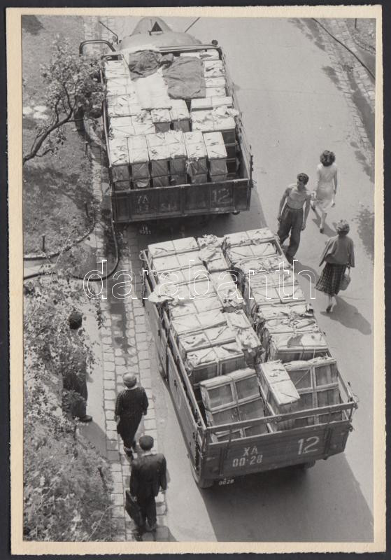 cca 1950 Szocreál fotó csomagszállító teherautóval, kartonra kasírozva... https://www.darabanth.com/de/191-Fernauktion/191.0/Andere-Sammelgebiete/Foto~600035/cca-1950-Szocreal-foto-csomagszallito-teherautoval-kartonra-kasirozva-17x12cm~II724905