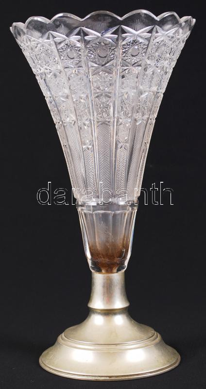 Ólomkristály váza fém talapzaton (száján apró lepattanás) /