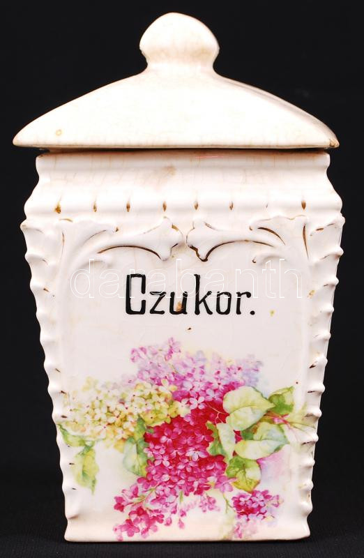 Fajansz fedeles cukortartó, jelzés nélküli, sérült, matricás, m: 19 cm https://www.darabanth.com/de/191-Fernauktion/191.0/Andere-Sammelgebiete/Keramiken~600011/Fajansz-fedeles-cukortarto-jelzes-nelkuli-serult-matricas-m-19-cm~II692167