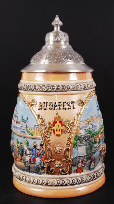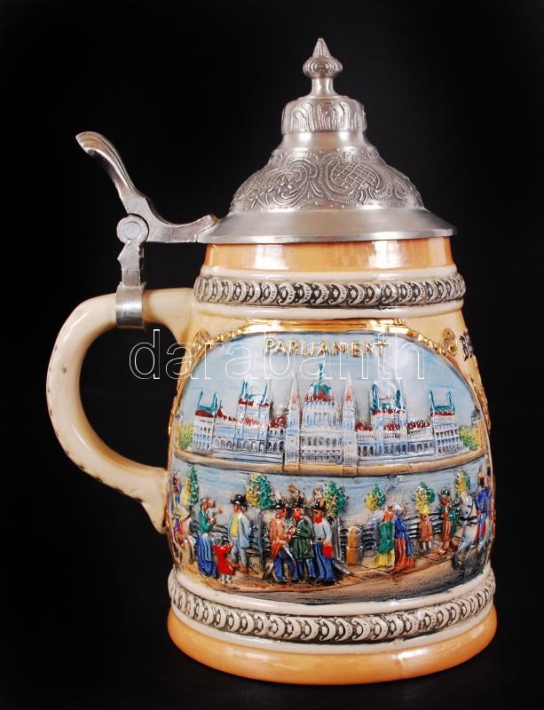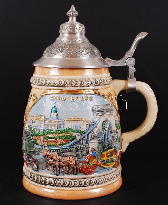 Beschreibung: Sörös korsó a Parlamenttel és a Lánchíddal, festett kerámia, jelzett, hibátlan, ón fedővel, m:19 cm / Budapest beer stein, perfect condition