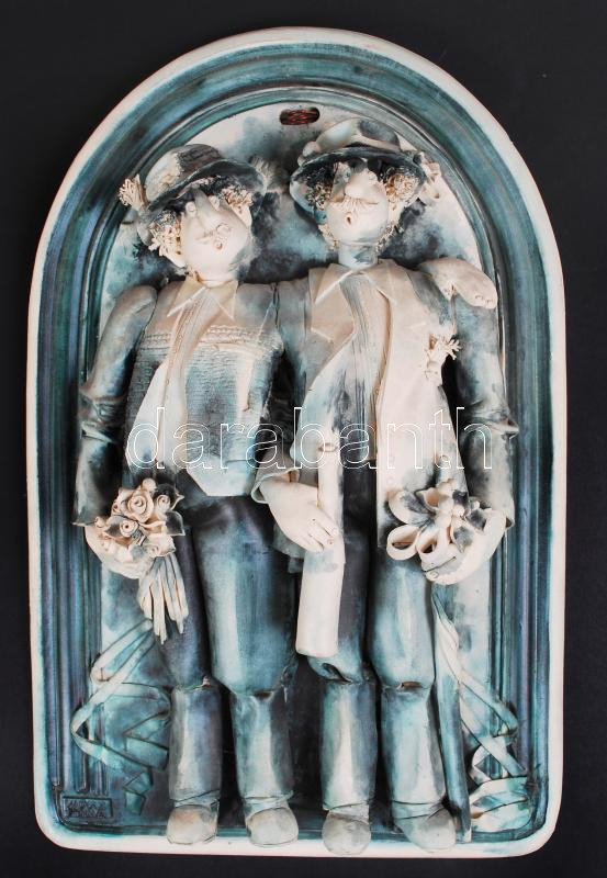 Beschreibung: Vadócz Anna (1951-): Vőfély és vőlegény. Festett fali kerámia, jelzett, hibátlan, 36×24 cm