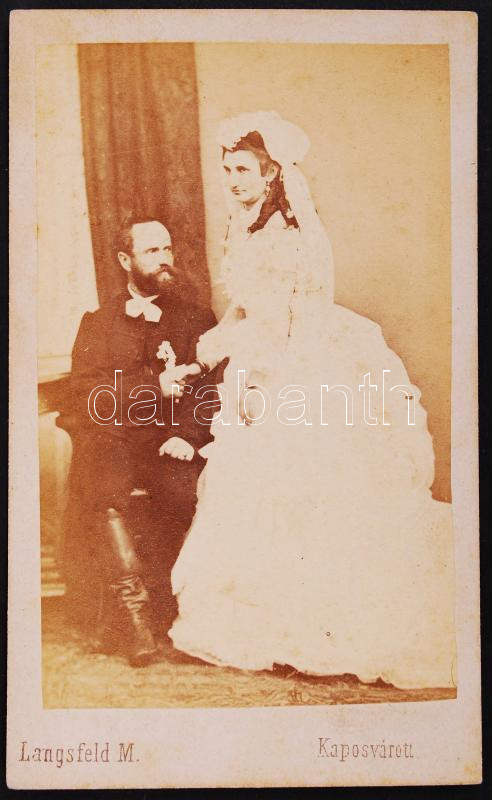 cca 1864-1865 Fornszek Sándor 1848/49-es huszárőrnagy és felesége Langsfeld Mór kaposvári műterméből, keményhátú fényképen, vizitkártya méretben, a kép hátoldalán felirat: "Fornszeg 1848 után 15 évet szenvedett hazafiasságáért, menyasszonya megvárta"