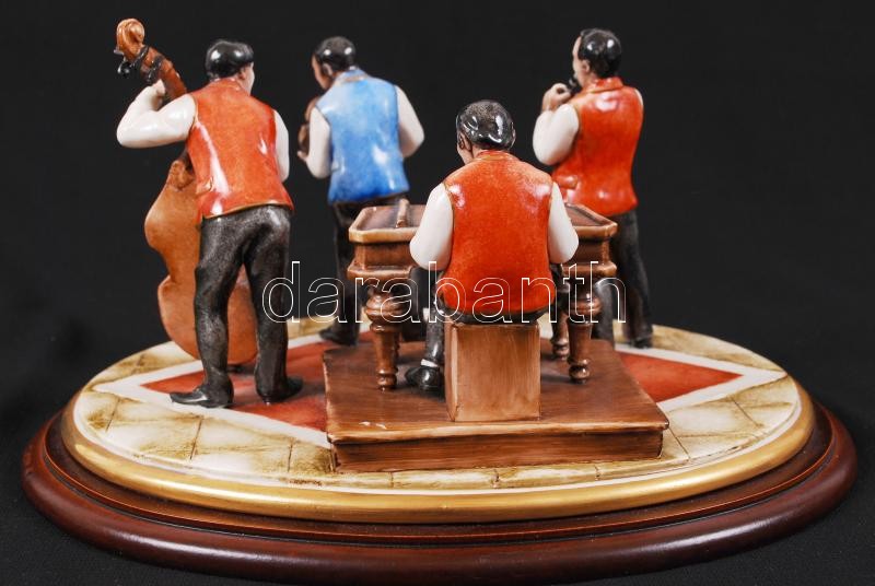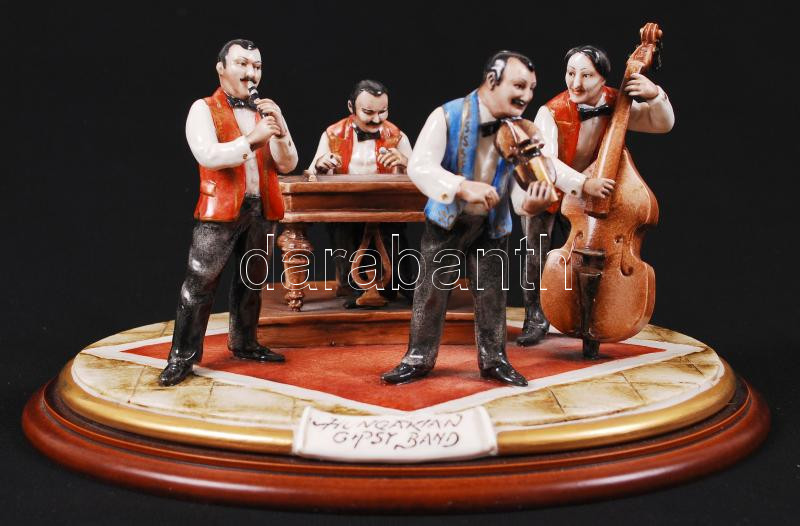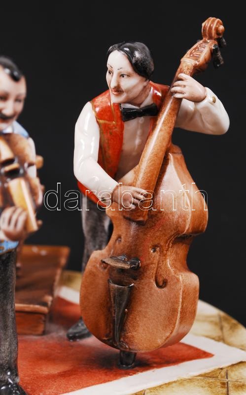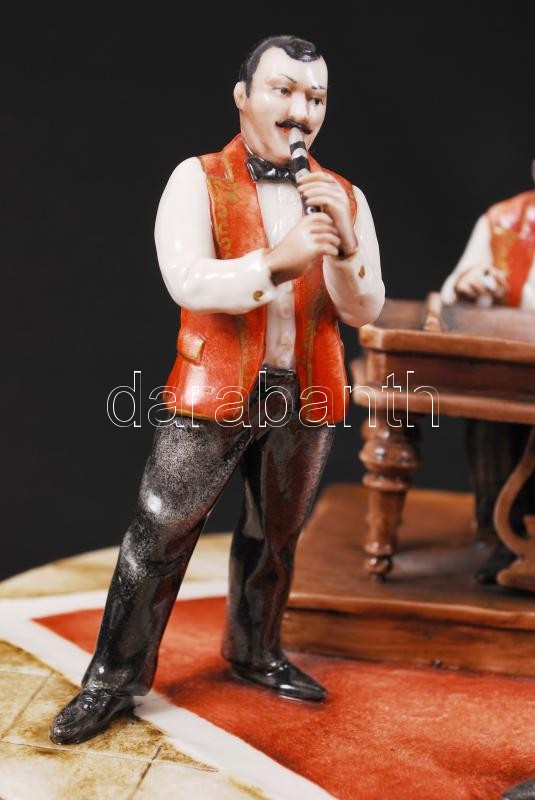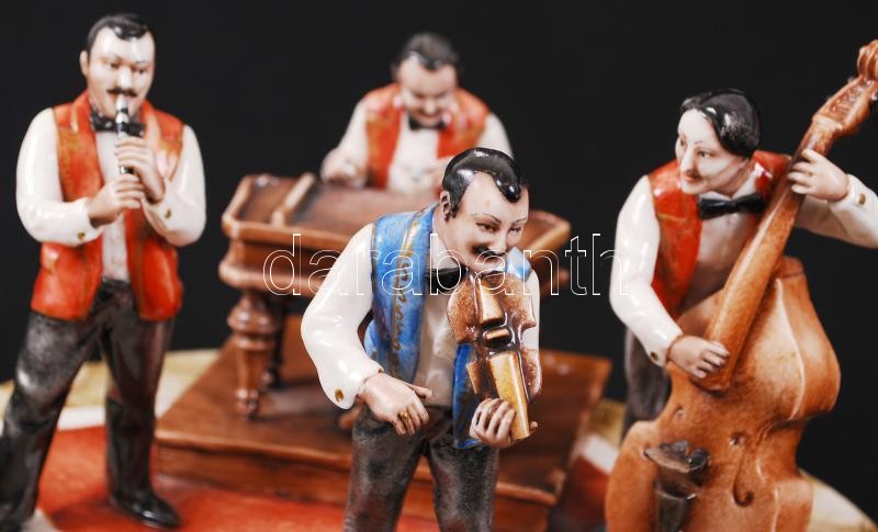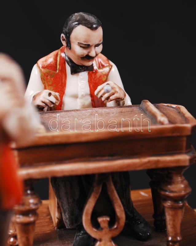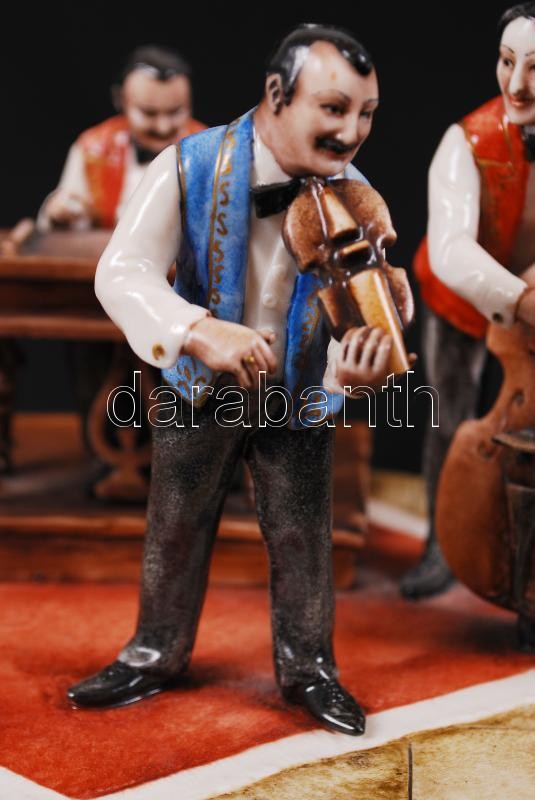Cigányprímás részére készült egyedi magyar cigányzenekart ábrázoló kézzel festett finoman kidolgozott porcelán, jelzés nélkül (hiányzó vonóval és ütővel) /Hand-painted porcelain figural composition of a gypsy band dedicated to a gypsy virtuoso (with small fault) 29x17cm