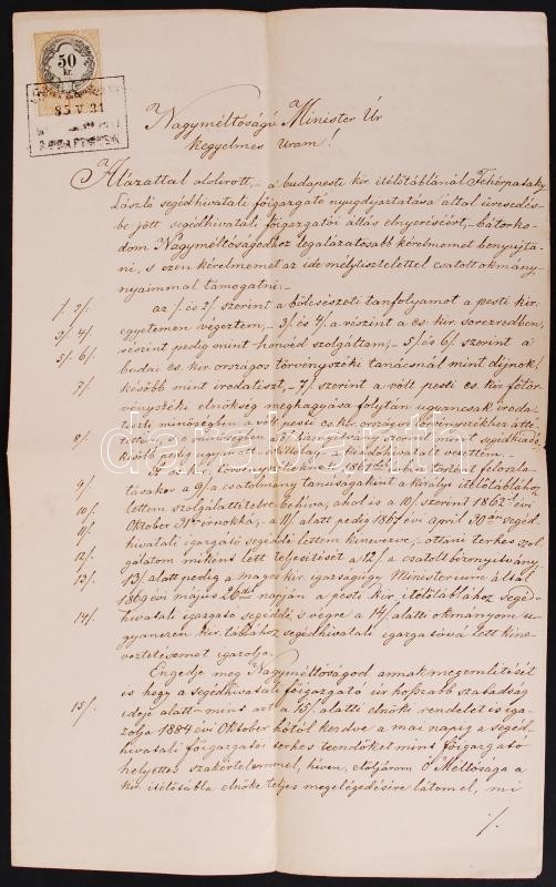Beschreibung: 1885 Vajkay Károly (1825-1893; szül. Zenger, írói álnevén Véka Lajos) jogi doktor, író aláírása hivatalos iraton a Budapesti M. Kir. Ítélőtábla elnökeként
