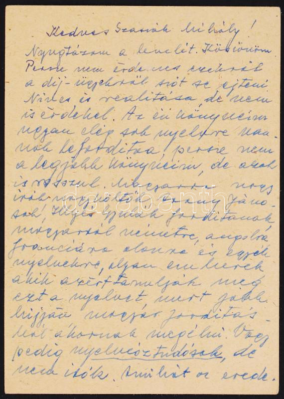 Beschreibung: 1967 Veres Péter (1897-1970) író, politikus, honvédelmi miniszter saját kézzel írt, aláírt levelezőlapja