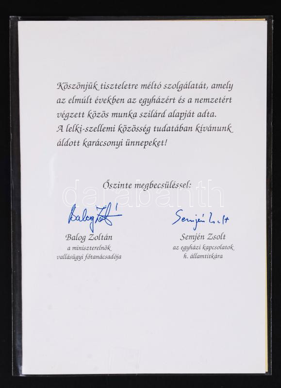 Beschreibung: Semjén Zsolt miniszterelnök helyettes és Balogh Zoltán államtitkár aláírása üdvözlőlapon