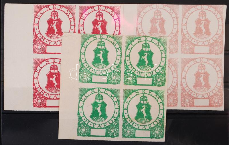 Kecskemét város értékszám nélküli színnyomata 3 klf ívszéli négyestömb... https://www.darabanth.com/de/191-Fernauktion/191.0/Andere-Sammelgebiete/Stempelmarken~600029/Kecskemet-varos-ertekszam-nelkuli-szinnyomata-3-klf-ivszeli-negyestombokben~II720614