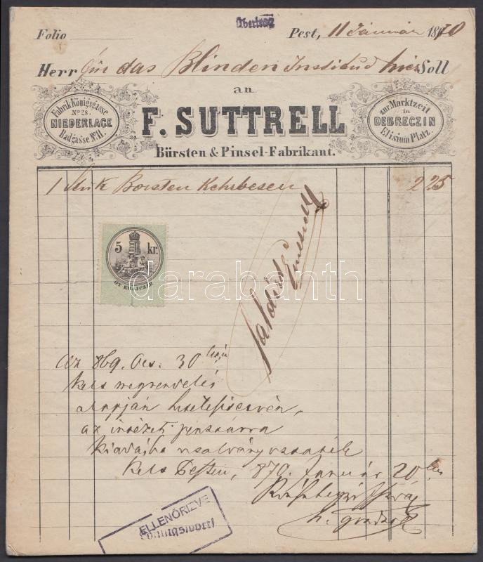 Beschreibung: 1870 Debrecen, F. Suttrell Bürsten und Pinsel-Fabrikant. Debreceni kefe- és ecsetkereskedő díszes fejléces számlája, kartonra kasírozva