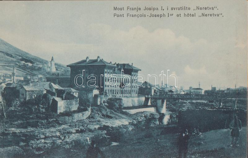 Mostar, Hotel Neretva, Franz Joseph bridge https://www.darabanth.com/de/191-Fernauktion/191.0/Ansichtskarten/Bosnien-Herzegowina~600046/Mostar-Hotel-Neretva-Franz-Joseph-bridge~II718644
