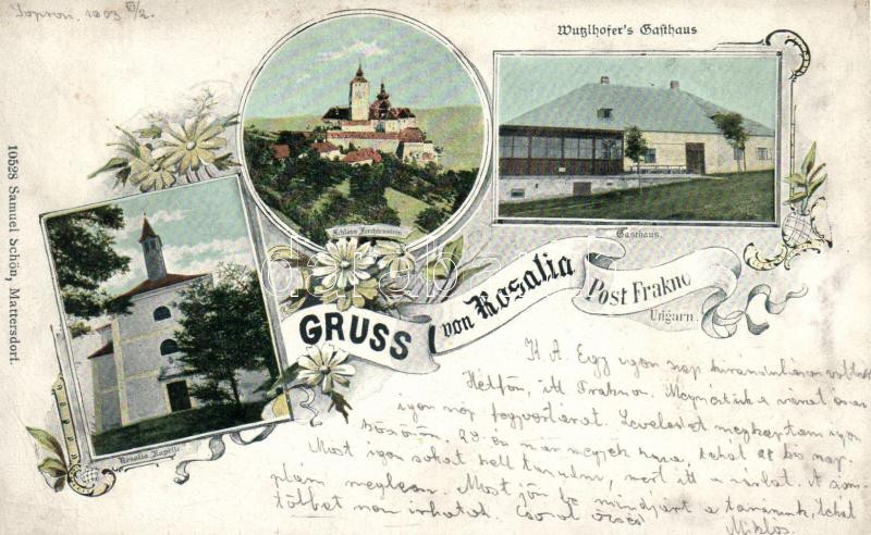 Fraknó Wutzlhofer's guest house, Rosalia chapel, castle, floral (small... https://www.darabanth.com/de/191-Fernauktion/191.0/Ansichtskarten/Burgenland~400027/Frakno-Wutzlhofers-guest-house-Rosalia-chapel-castle-floral-small-tear~II723900