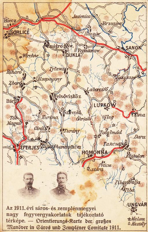 Az 1911. évi Sáros és Zemplén megyei nagy fegyvergyakorlatok tájékoztató térképe / Informing map of the weapon practice, Sáros and Zemplén county 1911 (fa)