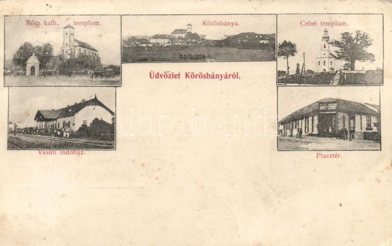 Kőrösbánya Római katolikus és Cebei templom, indóház, Piactér / church... https://www.darabanth.com/de/191-Fernauktion/191.0/Ansichtskarten/Siebenburgen~400022/Korosbanya-Romai-katolikus-es-Cebei-templom-indohaz-Piacter-church-railway-station-mar~II724420