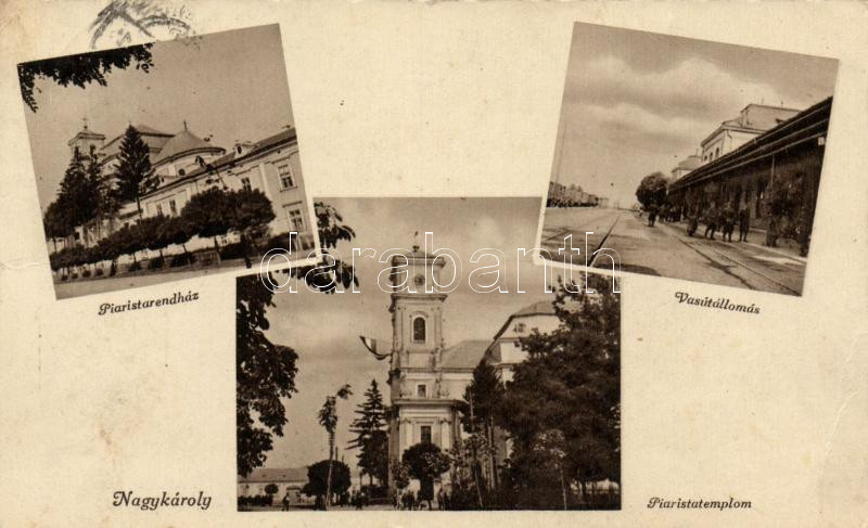 Nagykároly railway station, Piarist church and monastery (fa) https://www.darabanth.com/de/191-Fernauktion/191.0/Ansichtskarten/Siebenburgen~400022/Nagykaroly-railway-station-Piarist-church-and-monastery-fa~II720962