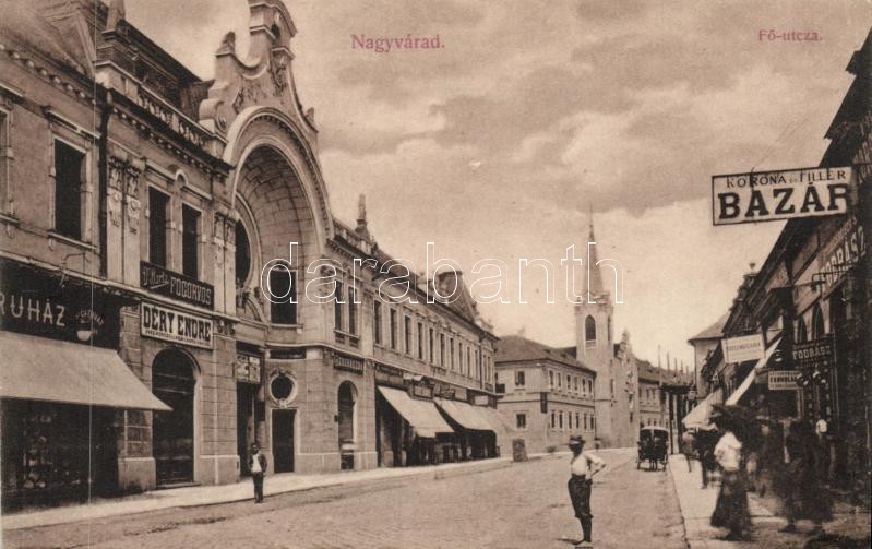 Beschreibung: Nagyvárad, main street, the shop of Endre Déry, dentist surgery of Dr. Barta, confectionery, hairdress salon (EK)