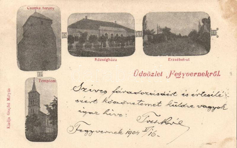 Beschreibung: Fegyvernek, csonka torony, községháza, Erzsébet út, templom (fl)