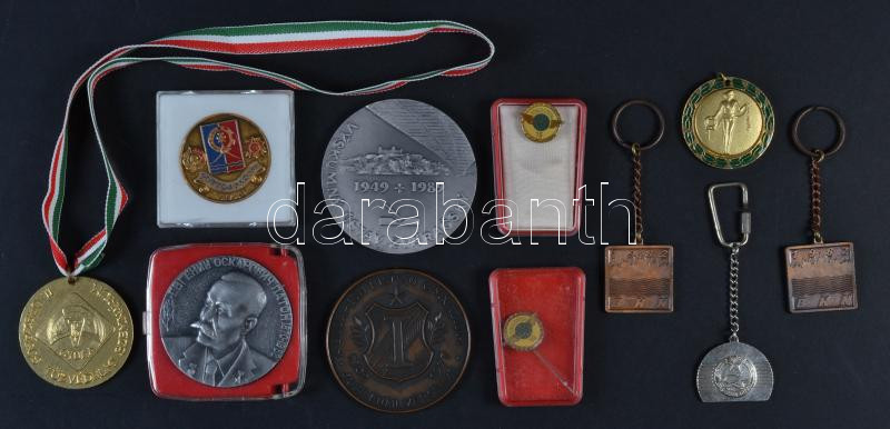 10db vegyes magyar és külföldi jelvény, emlékérem, sportérem és kulcstartó, benne "Törzsgárda-IBUSZ" jelvény (2x), MHSZ kulcstartók, 1977. "A Budapesti I. István Gimnázium Jubielumi Versenye" Br emlékérem (64mm) T:vegyes