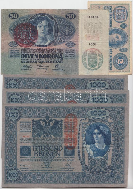 Beschreibung: 1902. 1000K mindkét oldal német, "Deutschösterreich" felülnyomással (3x) T:III + 1914. 2K + 50K piros "Magyarország" felülbélyegzéssel T:III