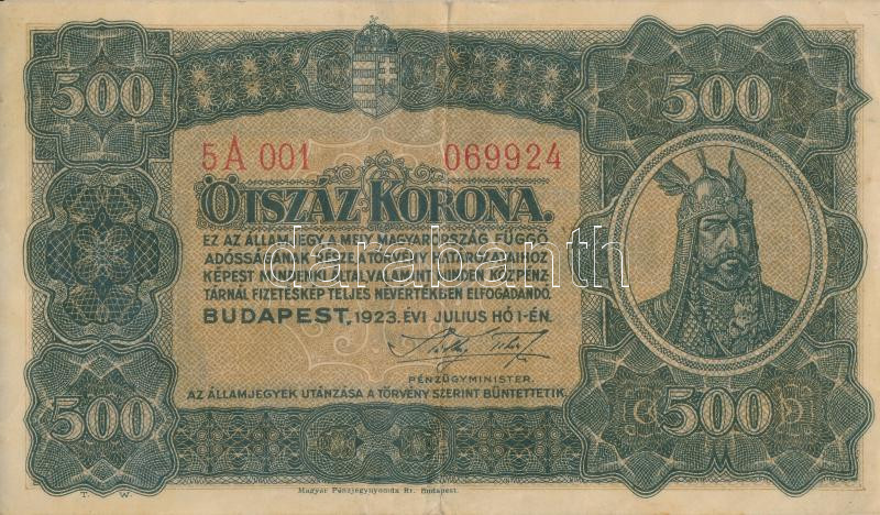 Beschreibung: 1923. "Magyar Pénzjegynyomda Rt" 500K T:II-