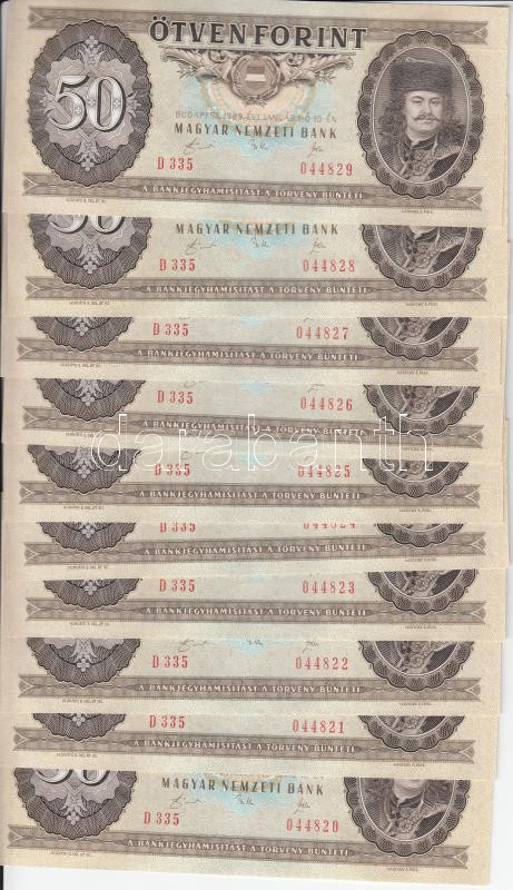 1989. 50Ft (10x) egymás utáni sorszámmal és nyomdai papírránccal T:I https://www.darabanth.com/de/191-Fernauktion/191.0/Numismatik/Ungarische-Banknoten~200009/1989-50Ft-10x-egymas-utani-sorszammal-es-nyomdai-papirranccal-TI~II724227