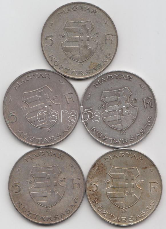 1947. 5Ft Ag "Kossuth" (5x) T:vegyes https://www.darabanth.com/de/191-Fernauktion/191.0/Numismatik/Ungarische-Munzen~200010/1947-5Ft-Ag-Kossuth-5x-Tvegyes~II721499
